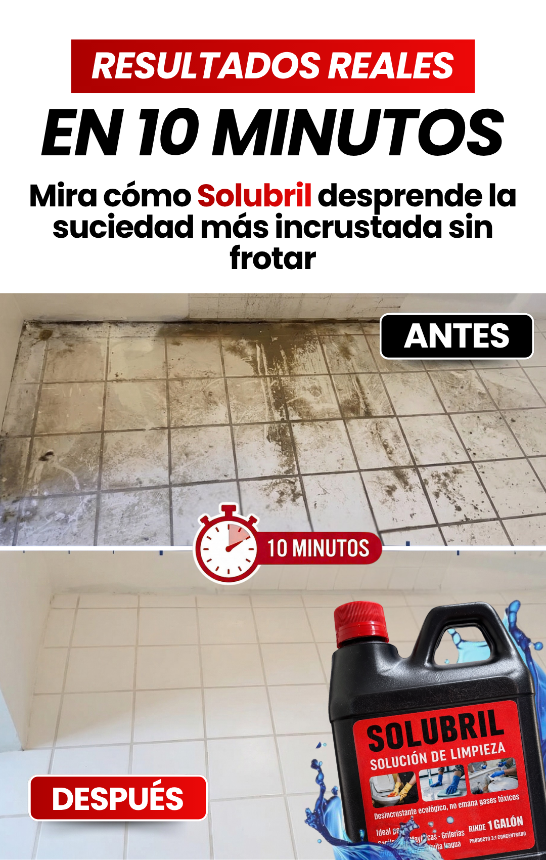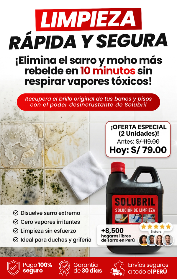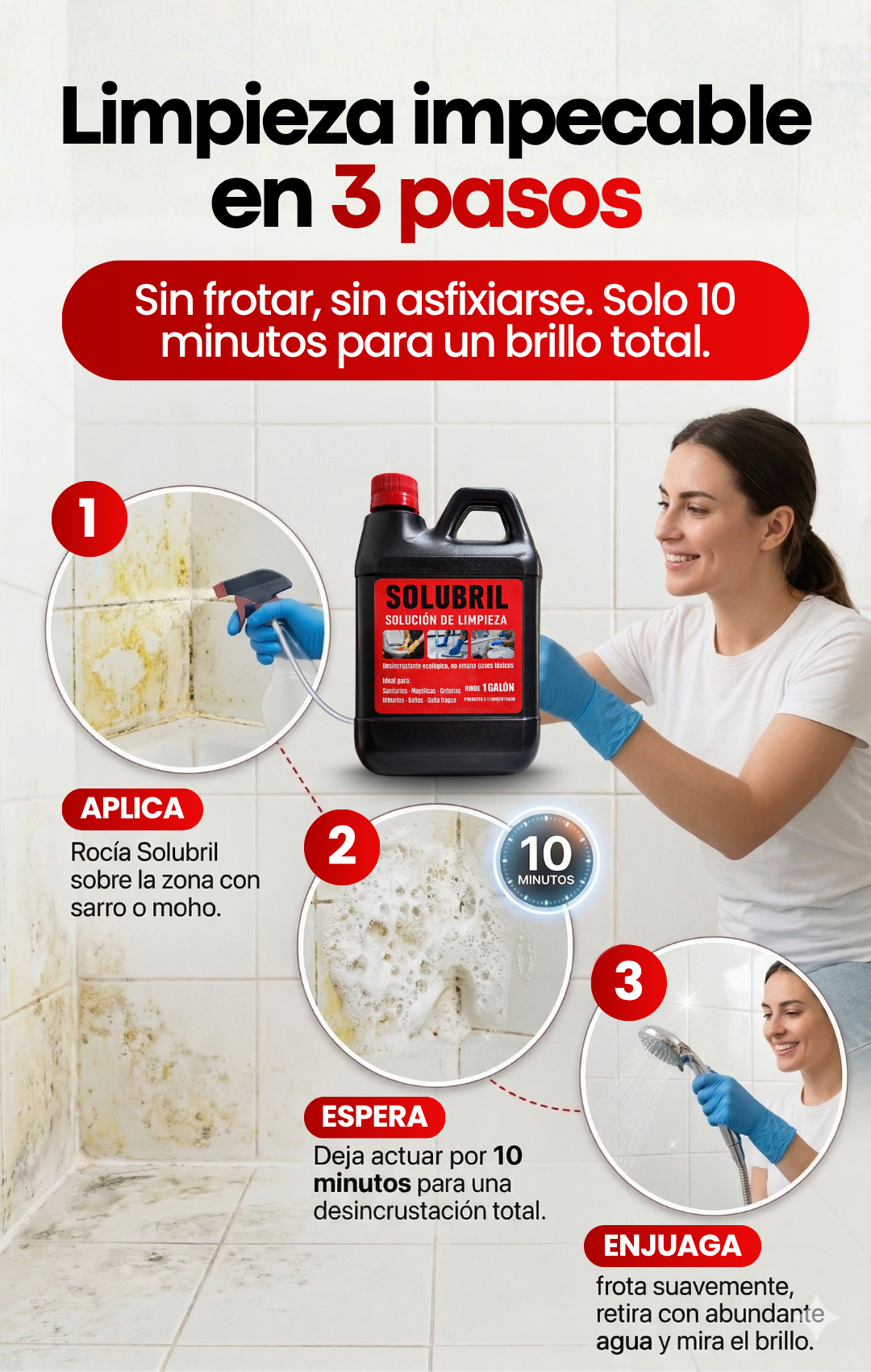 ¿Sarro y moho en la ducha, inodoro o grifería? Solubril lo elimina al 100% con solo aplicar y esperar. Sin vapores agresivos, sin agotarte.