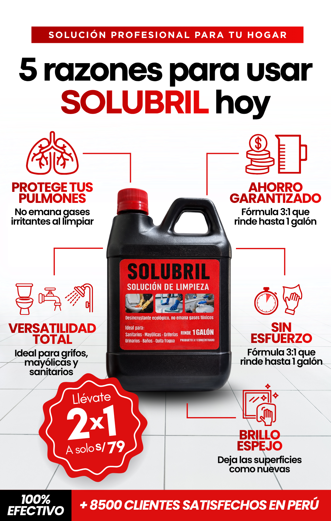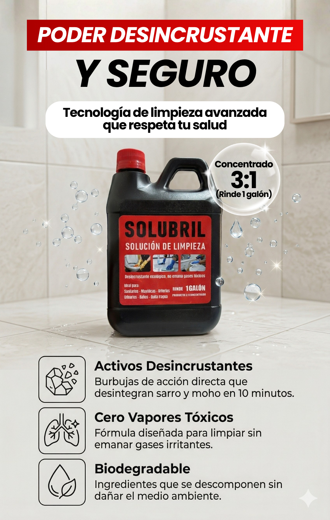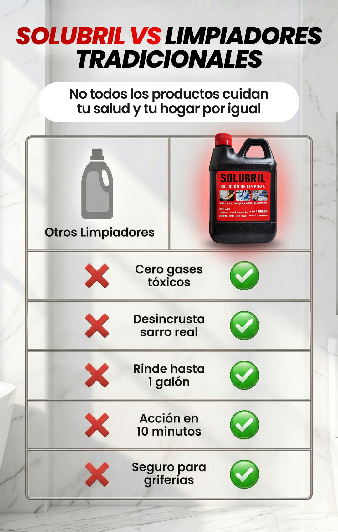 ¿Sarro y moho en la ducha, inodoro o grifería? Solubril lo elimina al 100% con solo aplicar y esperar. Sin vapores agresivos, sin agotarte.